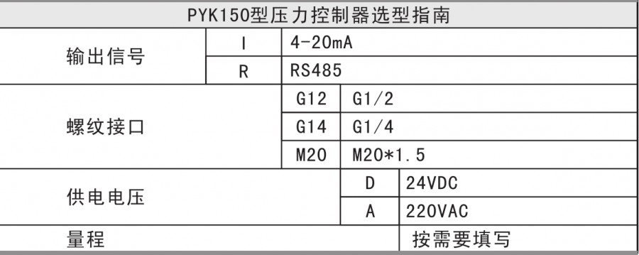 The PYK150 intelligent pressure controller is an intelligent digital pressure measurement and control product that integrates pressure measurement, display, output, and five-way control. Stainless steel joint, diffused Silicon pressure core body, whole digital circuit board, display intuitive, simple operation, safe and reliable, switch point set on site. Widely used in hydropower, tap water, petroleum, chemical, mechanical, hydraulic and other industries, the pressure of the fluid medium is measured and controlled, and the output(4-20mA) and RS485 network can be transmitted.